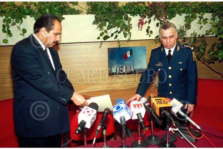 José Trinidad Larrieta de la PGR y Rafael Maceda de la Concha procurador militar anunciaron la detencion de los generales Mario Acosta Chaparro y Francisco Quiroz Hermosillo por el cargo de delitos contra la salud y participar y colaborar al cartel de Amado Carrillo, FOTO: Eduardo Loza/CUARTOSCURO.COM
