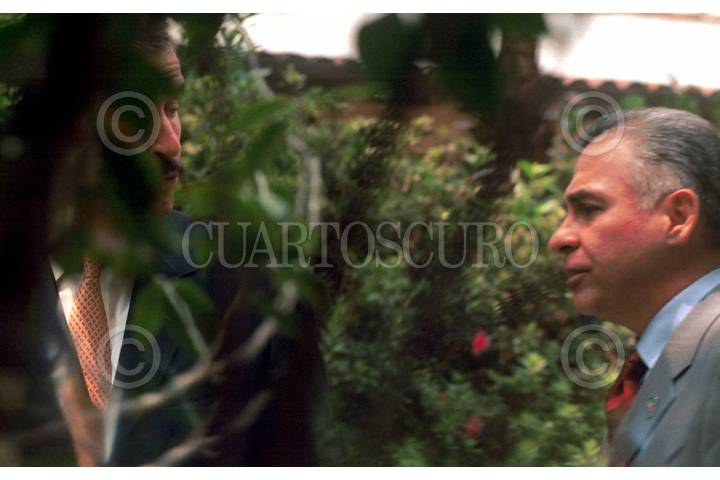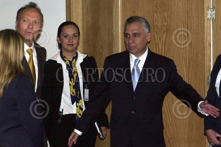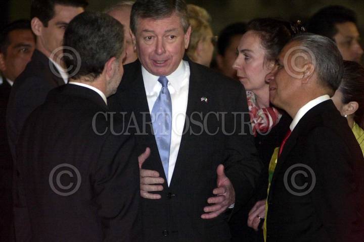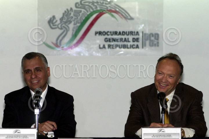 John Ashcroft, Procurador de Justicia de Estados Unidos (al centro) y Rafael Macedo de la Concha, Procurador General de la República de México (der.), durante la bienvenida oficial a la comitiva norteamericana que participara en la Reunión Binacional México-Estados Unidos, en el Muse de Antropología e Historia FOTO: Oswaldo Ramírez/CUARTOSCURO.COM