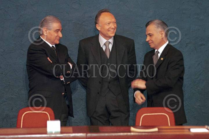 Santiago Creel, secretario de Gobernación y Rafael Macedo de la Concha, procurador General de la República y Carlos Abascal, secreatrio del Trabajo, durante la ceremonia del 197 natalicio del Benemérito de las Américas, Benito Juárez. FOTO: Oswaldo Ramírez/CUARTOSCURO.COM