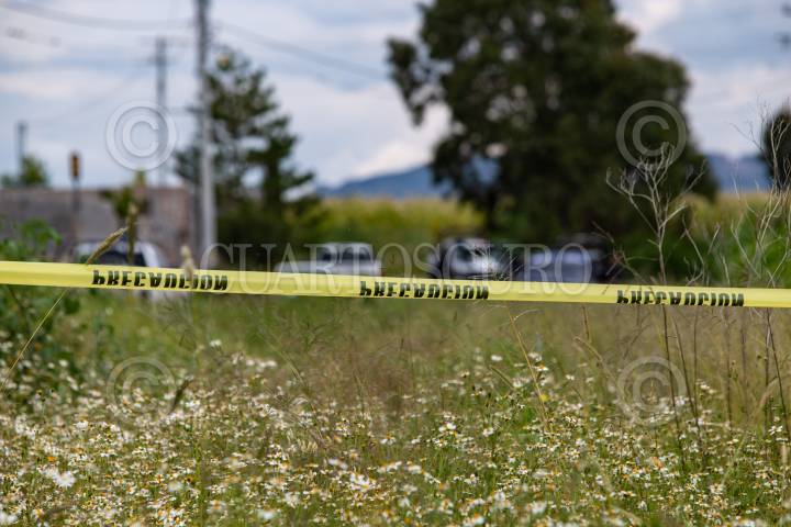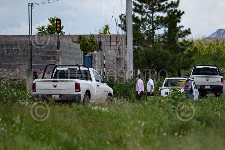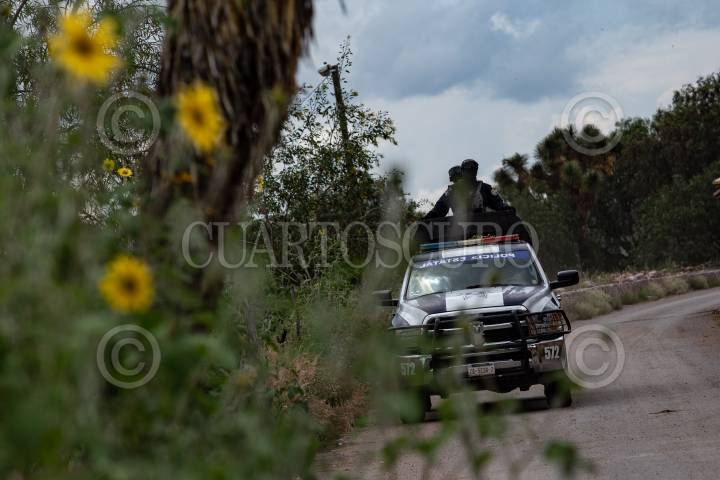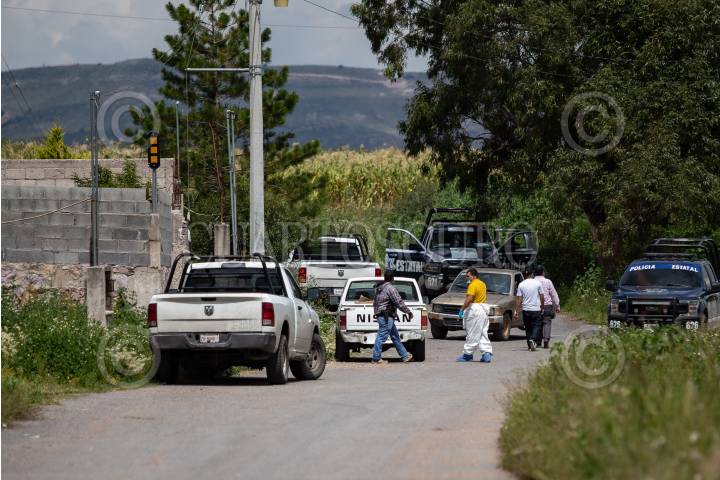 Policías de investigación y peritos de la Fiscalía General de Justicia del Estado entran y salen de una finca en la comunidad de Machines. En el lugar fueron encontrados diez cuerpos humanos semi enterrados en una fosa clandestina en el interior del inmueble.
