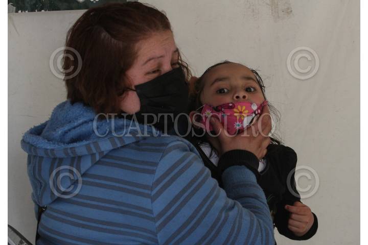 Madre sostiene la cara de su hija momentos antes de realizarle la prueba para la detección de COVID-19z
