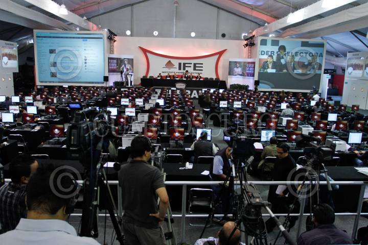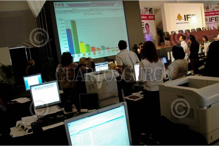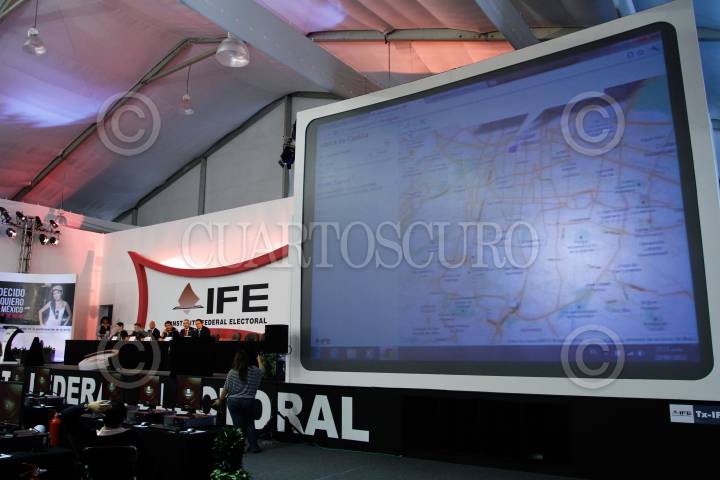 MÉXICO D.F., 05JULIO2009.- El Programa de Resultados Electorales Preliminares (PREP) comienza a ser visible en las pantallas de la Macrosala dando a conocer avances y estadisticas del resultado de la jornada electoral 2009 que se celebro hoy en todo el país. FOTO: RODOLFO ANGULO/CUARTOSCURO.COM
