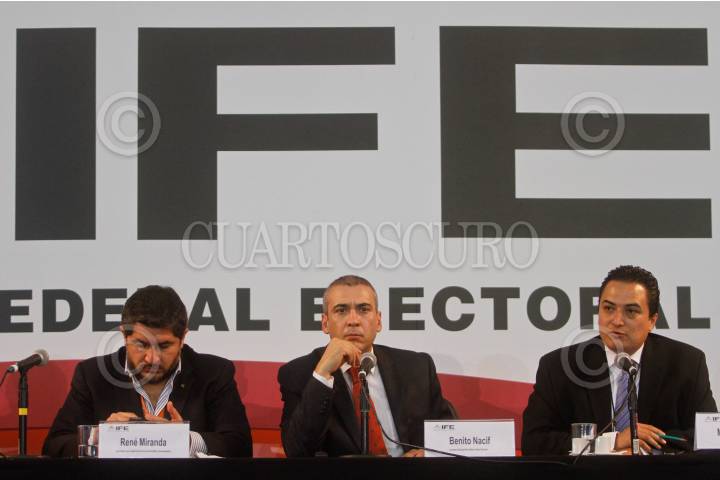 MÉXICO, D.F., 29JUNIO2012.- René Miranda, coordiador de la Unidad de Servicios de Informática del IFE, Benito Nacif, consejero electoral, y Manuel Tamez, director de Google México, durante la conferencia de prensa donde presentaron el programa de colaboración entre el Instituto Federal Electoral y Google. FOTO: ISAAC ESQUIVEL /CUARTOSCURO.COM