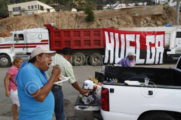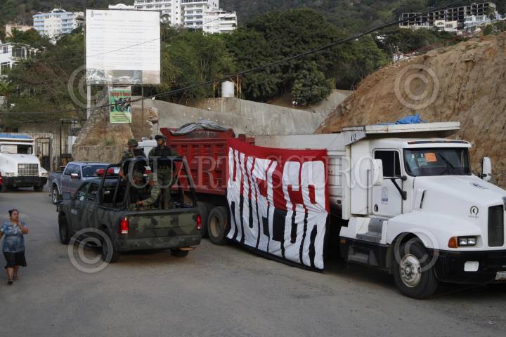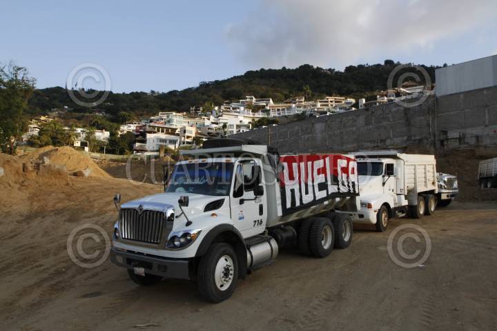 ACAPULCO, GUERRERO, 27FEBRERO2014.- Trabajadores del Macrotunel iniciaron una huelga alrededor de las 14:00 horas, para exigir el pago doble por las jornadas nocturnas. Los inconformes, pertenecientes a la Confederación Revolucionaria de Obreros y Campesinos, apostaron una veintena de camiones de volteo en la avenida Ejército Mexicano, en la colonia Joyas de Brisamar, obstaculizando los tres accesos a la obra que se encuentran en la zona, colocaron banderas rojinegras en la oficina de Grupo Carso e ICA en la obra responsables del proyecto. FOTO: BERNANDINO HERNÁNDEZ /CUARTOSCURO.COM