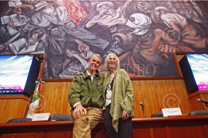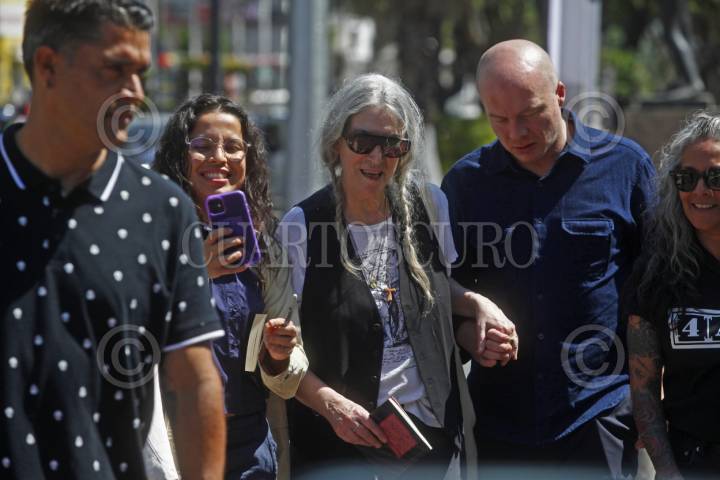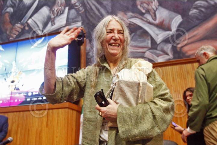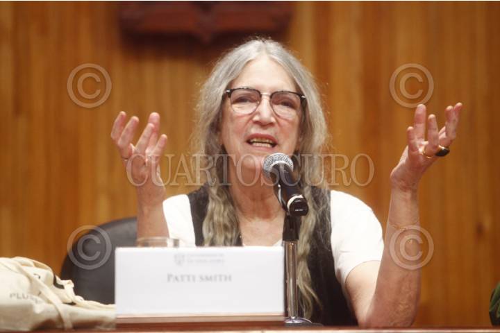 GUADALAJARA, JALISCO, 27FEBRERO2024.- Este medio día en las instalaciones de Paraninfo Enrique Díaz de León, se llevo a cabo una conferencia de prensa con la cantante estadounidense Patti Smith, conocida en el ámbito musical como la “Madrina del Punk” esto para dar los pormenores acerca de la presentación de Correspondences, una expresión artística revolucionaria, realizada junto con el Soundwalk Collective (integrado por Stephan Crasneanscki y Simone Merli). Se trata de una muestra inmersiva de artes sonoras, cuya instalación será gratuita, que se podrá admirar en la sala 3 del Conjunto Santander de Artes Escénicas, y que será acompañada por un performance de la artista y Soundwalk Collective, este miércoles 28 de febrero. FOTO: FERNANDO CARRANZA GARCIA / CUARTOSCURO.COM