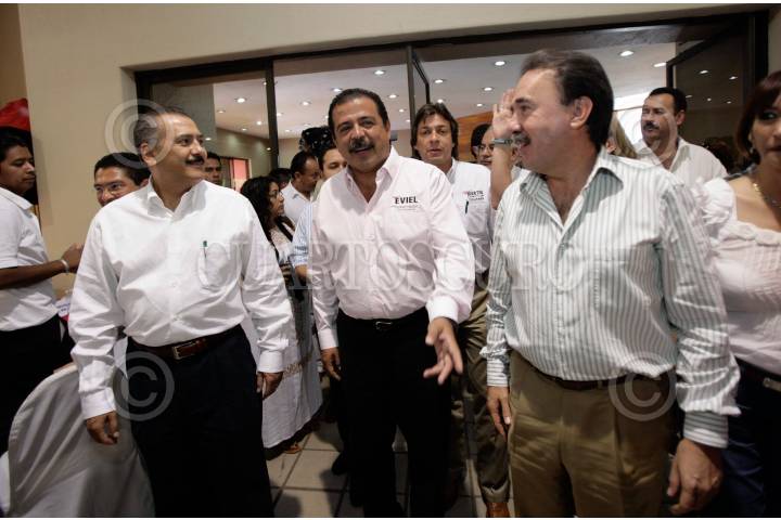 OAXACA, OAXACA, 24JUNIO2010.- Manlio Fabio Beltrones, coordinador de los senadores priistas, Eviel Pérez Magaña, candidato a la gubernatura de Oaxaca y Emilio Gamboa Patrón, dirigente nacional de la CNOP, durante un encuentro con militantes en el marco de su campaña proselitista por el estado. FOTO: CUARTOSCURO.COM