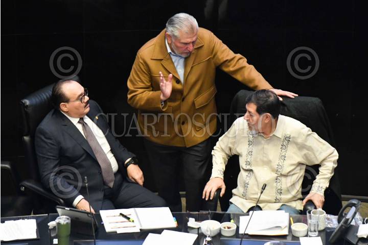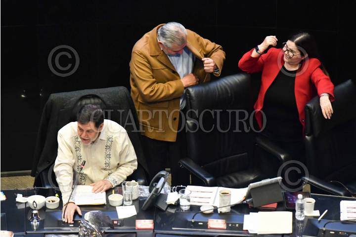 CIUDAD DE MÉXICO, 30ENERO2025.- Continúa el procedimiento de insaculación pública de las personas elegibles aprobadas por el Comité de Evaluación del Poder Judicial de la Federación para las elecciones de magistraturas y ministros, llevada a cabo por parte de la mesa directiva del Senado de la República. En la imagen, Adán Augusto López, senador y coordinador del grupo parlamentario de Morena, junto a Gerardo Fernández Noroña, presidente de la mesa directiva, e Imelda Castro, vicepresidenta de la mesa directiva. FOTO: MARIO JASSO/CUARTOSCURO.COM
