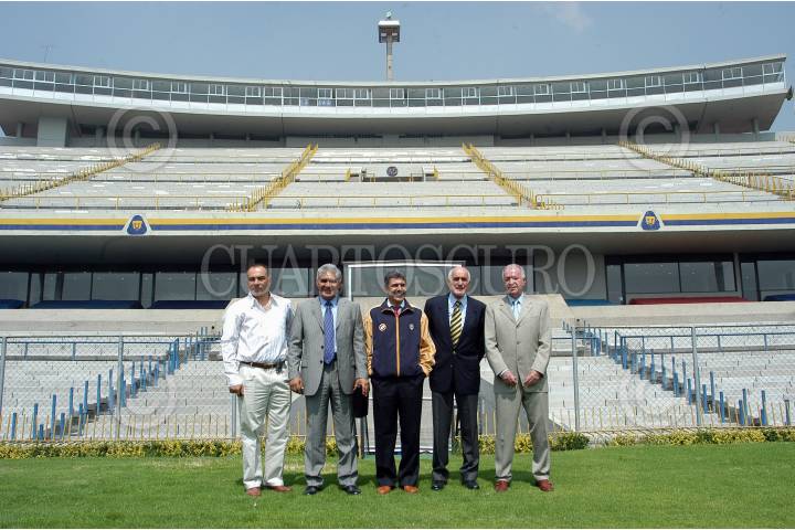 MEXICO D.F. 23MAYO2006.- En la cancha del estadio olimpico México 68, se realizo la ceremonia de presentación del nuevo director tecnico de los Pumas. Guillermo Vazquez, Mario Trejo, Ricardo ¨Tuca ¨ Ferreti, Víctor Mahbub y Aarón Padilla. FOTO: Germán Romero/CUARTOSCURO.COM