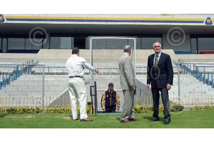 MEXICO D.F. 23MAYO2006.- En la cancha del estadio olimpico México 68, se realizo la ceremonia de presentación del nuevo director tecnico de los Pumas. Guillermo Vazquez, Aarón Padilla y Víctor Mahbub esperan la llegada del ¨Tuca¨ Ferreti. FOTO: Germán Romero/CUARTOSCURO.COM