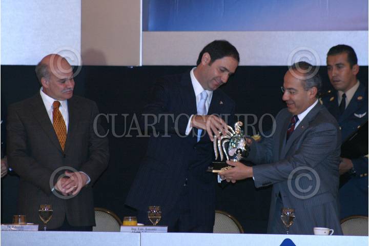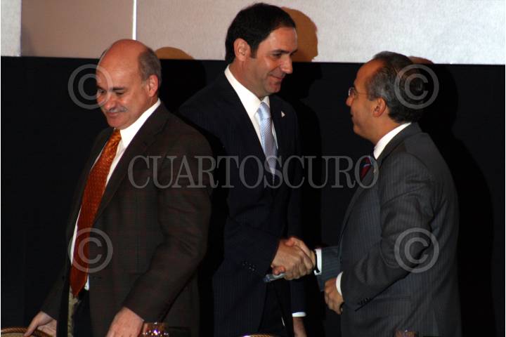 MÉXICO,D,F.,23 NOVIEMBRE2007.- Eduardo Sojo secretario de economia,Luis Antonio Mahbub presidente de la confederación de camaras internaconales de comercio, servicios y turismo etregó a Felipe Calderon Presidente de los estados unidos mexicanos un reconocimiento, durante la celebración del 90 aniversario de la confederación de camaras nacionales de comercio, servicio y turismo. FOTO: SASHENKA GUTIERREZ/CUARTOSCURO.COM