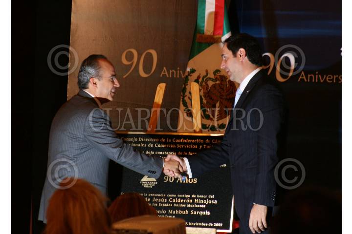 MÉXICO,D,F.,23 NOVIEMBRE2007.- Eduardo Sojo scretario de economia, Luis Antonio Mahbub, Presidente de la condederación de camaras Nacionales de comercio servicios y turismo, saluda a Presidente Felipe Calderon Presidente de los Estados Unidos Mexicanos, durante la celebración del 90 aniversario de la confederación de camaras nacionales de comercio, servicio y turismo. FOTO: SASHENKA GUTIERREZ/CUARTOSCURO.COM
