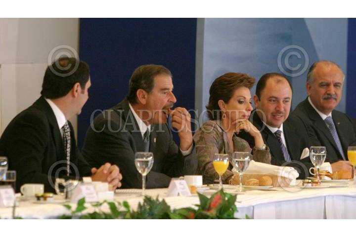 MEXICO, D.F., 23FEBRERO2006.- Luis Antonio Mahbub Sarquis, presidente de la CONCANACO, Vicente Fox Quesada, Presidente de la República, Marta Sahagún, esposa de mandatario y Raul Alejandro Padilla, CONCANACO, durante la ceremonia de la 90 Asamblea General Ordinaria de la CONCANACO, en un hotel de la zona de Polanco. FOTO: Moisés Pablo/CUARTOSCURO.COM