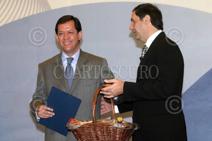 MEXICO, D.F., 23FEBRERO2006.- Roberto Campa, candidato a la presidencia de la República por el Partido Nueva Alianza y Luis Antonio Mahbub Sarquis, presidente de la CONCANACO, conversaron con integrantes de la Confederación de de Cámaras en el marco de su 90 Asamblea General Ordianria em un hotel de Polanco. FOTO: Moisés Pablo/CUARTOSCURO.COM