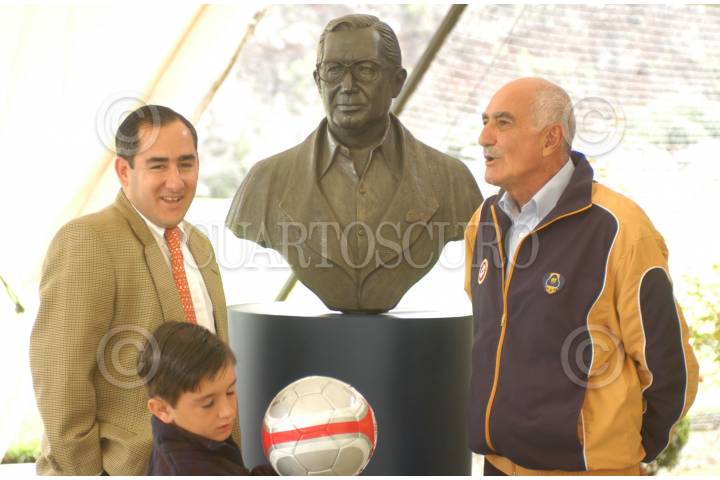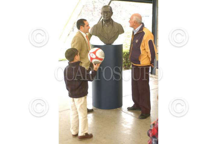 MÉXICO, D.F. 23JULIO2006.- En la cantera Puma a manera de homenaje develaron un busto del Guillermo Aguilar Alvarez Jr.. En la foto Roberto Aguilar Alvarez hijo del homenajeado y el presidente del Patronato del Club Universidad Nacional, A.C., ingeniero Víctor Mahbub Matta. Con un balón en la mano el niño Guillermo Aguilar Alvarez III. FOTO: CLUB UNIVERSIDAD NACIONAL/CUARTOSCURO.COM