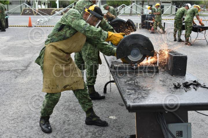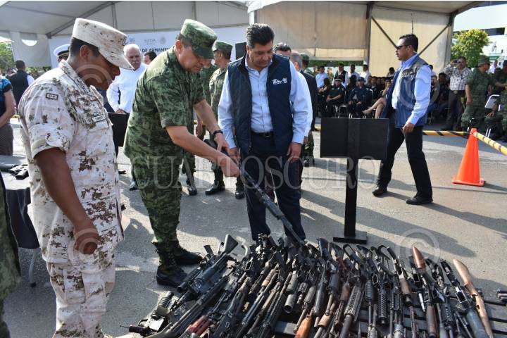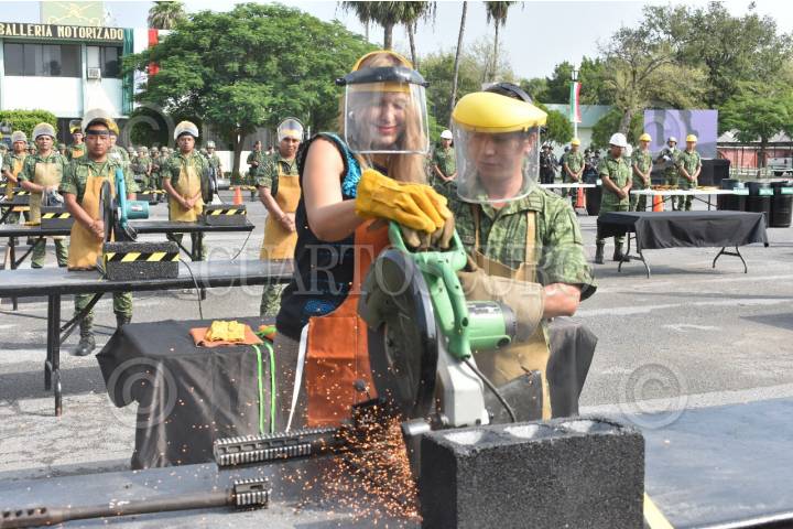 REYNOSA, TAMAULIPAS, 15OCTUBRE2018.- La Secretaría de la Defensa Nacional a través de la Comandancia de la IV Región Militar, informa que esta fecha se llevó a cabo en la explanada del 19/o. Regimiento de Caballería Motorizado de esta ciudad, la “Ceremonia masiva de destrucción de armamento”. El evento fue presidido por el C. General de División Diplomado de Estado Mayor Luis Crescencio Sandoval González, Comandante de la IV Región Militar, los acompaño el gobernador de la entidad Francisco García Cabeza de Vaca y la presidenta municipal de Reynosa, Maki Esther Ortiz. En la ceremonia se realizó la destrucción de 1,033 armas cortas y 2,198 armas largas, sumando un total de 3,231 aseguradas en los diversos mandos territoriales pertenecientes a la IV Región Militar. FOTO: SEDENA /CUARTOSCURO.COM