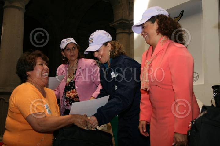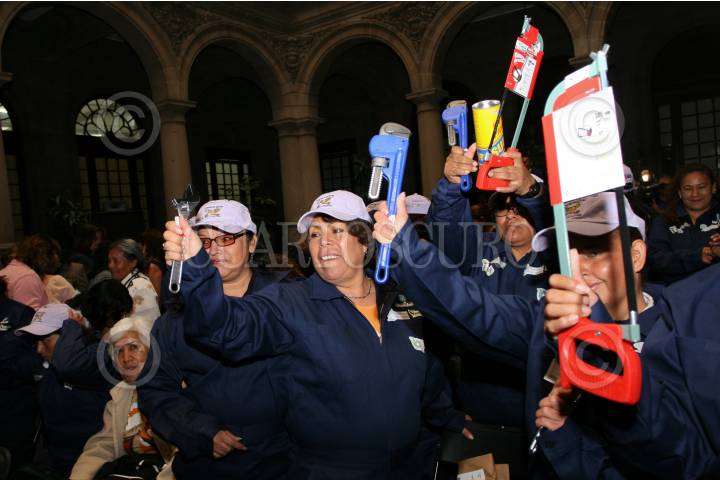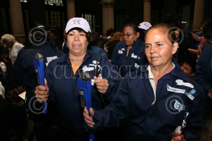 MÉXICO D.F., 13NOVIEMBRE2008.- Malú Micher, Directora del Instituto de la Mujer del D.F. Martha Delgado, titular de la Secretaria del Medio Ambiente del D.F. y Clara Brugada, Procuradora Social del D.F. realizaron la entrega de reconocimientos y equipos a la primera generación de mujeres plomeras. FOTO: GUILLERMO PEREA/CUARTOSCURO.COM