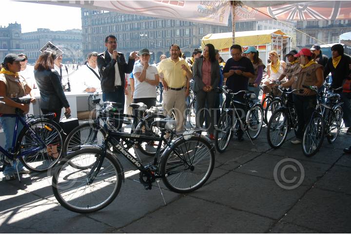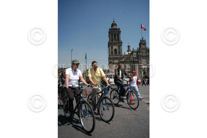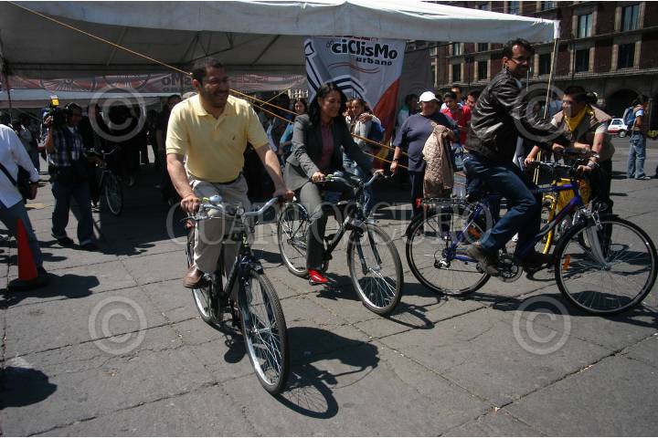 MÉXICO D.F. 19MARZO2007.- Martí Batres secretario de desarrollo social del gobierno capitalino acompañado de Malu Micher directora del instituto de la mujer del D.F. y Javier Hidalgo secretario del Intituto de la juventud, realizaron un recorrido por la plancha del Zócalo depués de tomar el curso para andar en bicicleta. FOTO: GUILLERMO PEREA/CUARTOSCURO.COM