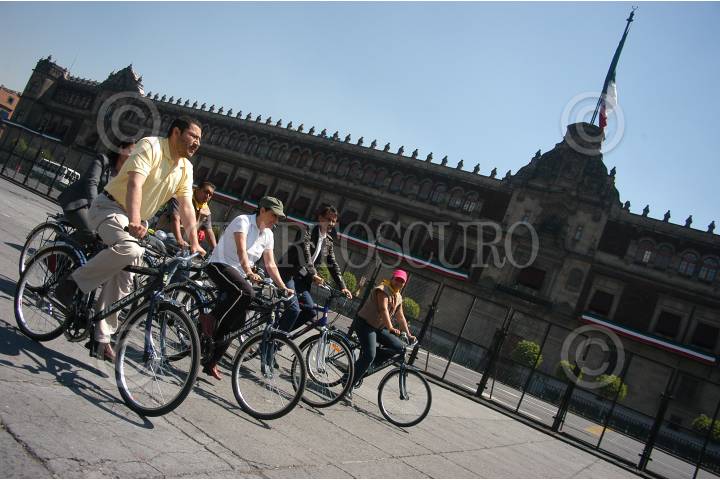 MÉXICO D.F. 19MARZO2007.- Martí Batres secretario de desarrollo social del gobierno capitalino acompañado de Dinora Pizano coordinadora de comunicación social de la delegación Gustavo A. Madero, Malu Micher directora del instituto de la mujer del D.F. y Javier Hidalgo secretario del Instituto de la juventud, realizaron un recorrido por la plancha del Zócalo después de tomar el curso para andar en bicicleta. FOTO: GUILLERMO PEREA/CUARTOSCURO.COM