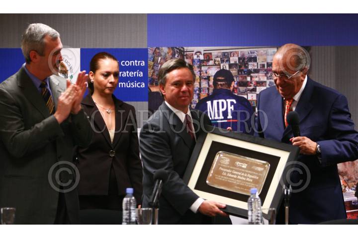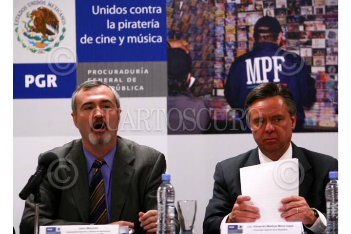 MÉXICO, D.F., 01ABRIL2008.- John Malcolm, vicepresidente ejecutivo y director de operaciones internacionale anti-piratería de la Motion Picture Association y Eduardo Medina Mora, Procurador General de la República, anunciaron a conocer la creación de la Asociación Protectota de Cine y Música de México A.C., unidas para combatir la piratería física y la de internet, durante una conferencia de prensa en la sede de la PGR. FOTO: MOISÉS PABLO/CUARTOSCURO