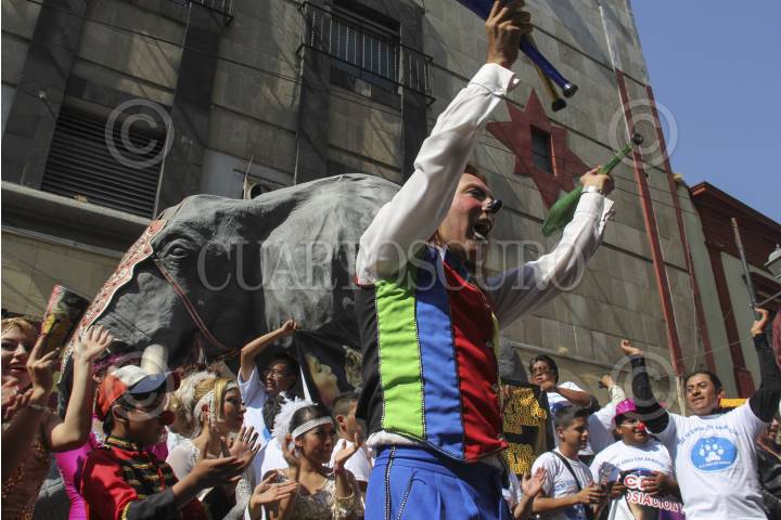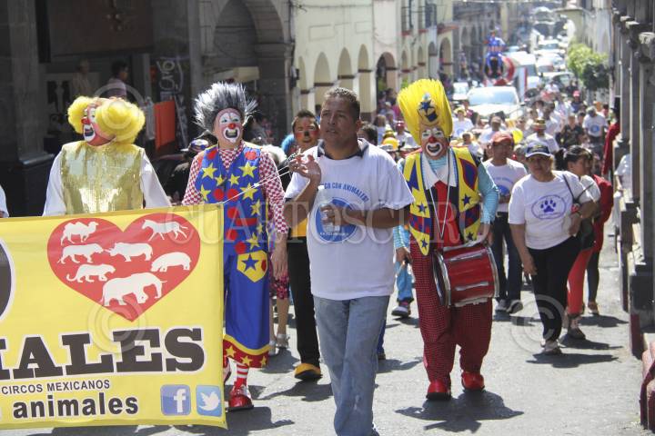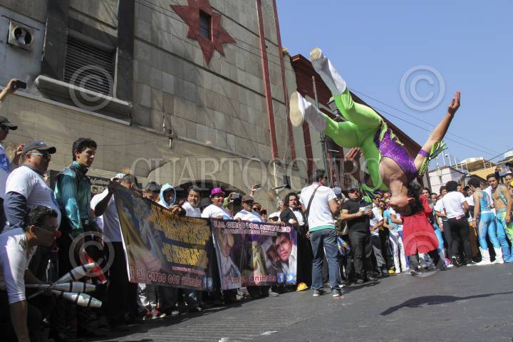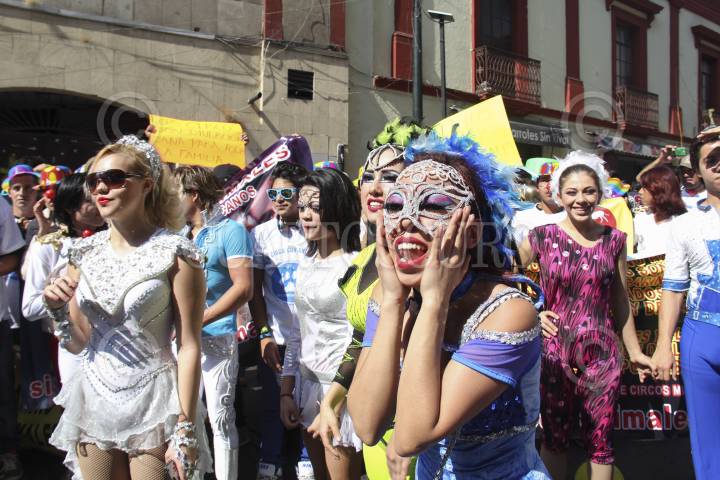 CUERNAVACA, MORELOS, 05FEBRERO, 2014.- Decenas de cirqueros integrantes de la Asociación de Circos Mexicanos marcharon por las calles de Cuernavaca para manifestarse en contra de la prohibición de circos con animales. Realizaron actos de acrobacia en su recorrido hasta llegar al Congreso del Estado. FOTO: PATRICIA MORALES /CUARTOSCURO.COM