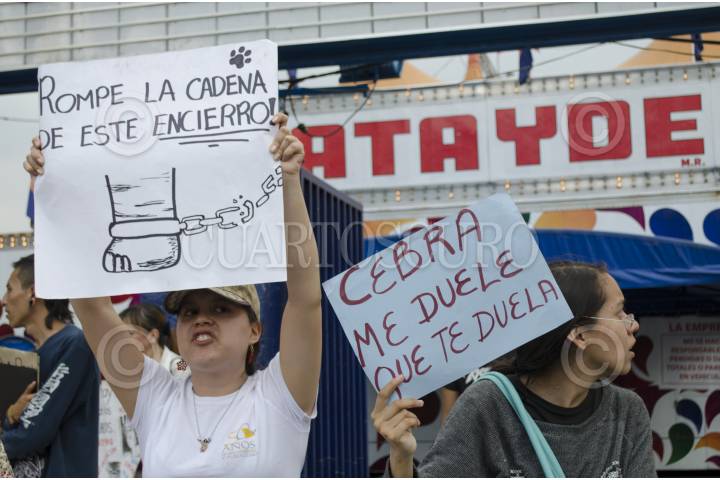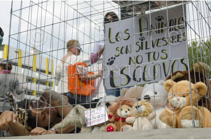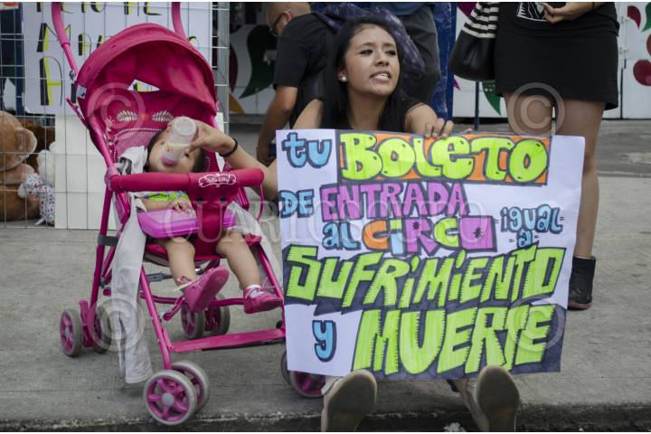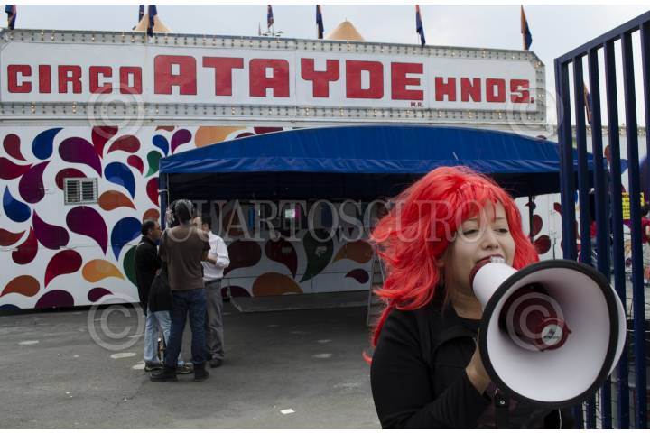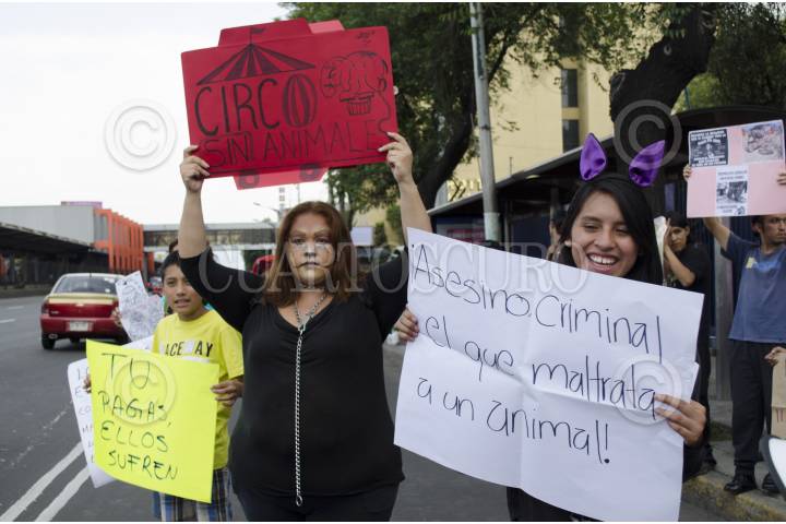 MÉXICO, D.F., 11MAYO2014.- Integrantes de la asociación en pro de los derechos de los animales, Anima Naturalis, protestaron frente al Circo Atayde Hermanos ubicado a una cuadra de la estación del metro Villa de Cortés. Consignas como "circos sí, pero sin animales" invitaban al público de las taquillas a que no compraran más boletos. Uno de los encargados del lugar pidió que no obstaculizaran la entrada y se deslindó de las consignas que acusaban al circo de maltrato animal. FOTO: MARÍA JOSÉ MARTÍNEZ /CUARTOSCURO.COM
