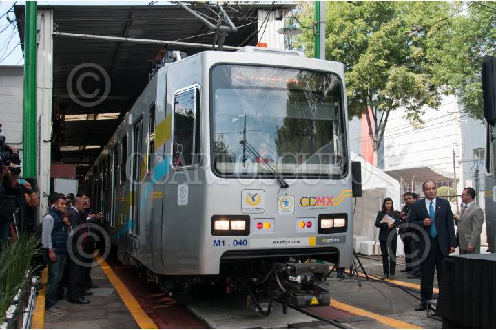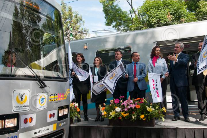 MÉXICO, D.F., 16MARZO2015.- Miguel Ángel Mancera, jefe de gobierno capitalino, acudió a las instalaciones del taller del Tren Ligero en Huipulco, a dar el banderazo de salida a 4 trenes ligeros nuevos que correrán en dicho sistema de Tasqueña a Xochimilco. Durante el evento asistieron Hiram Almeida, titular de la SSP DF, Rufino H. León Tovar, secretario de Movilidad capitalina, y Eduardo Venadero, director del Servicio de Transportes Eléctricos. FOTO: DIEGO SIMÓN SÁNCHEZ /CUARTOSCURO.COM