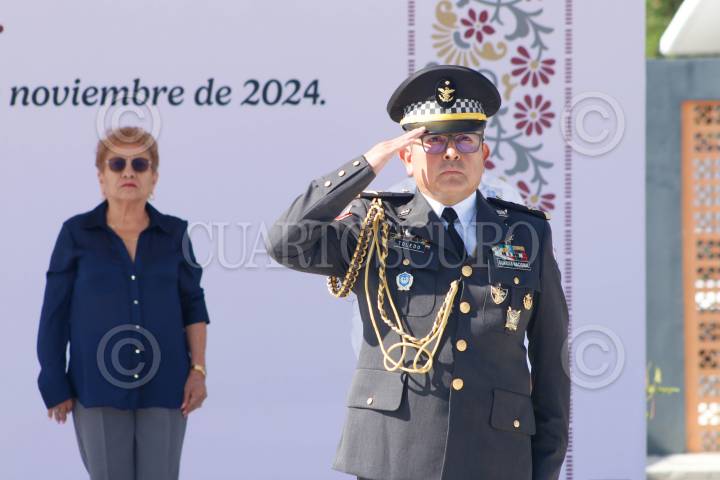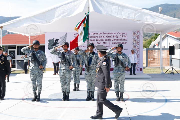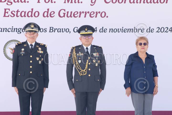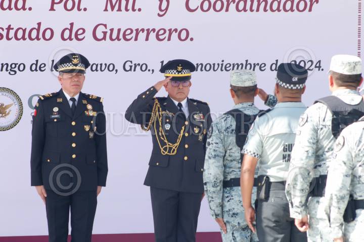 CHILPANCINGO, GUERRERO, 14NOVIEMBRE2024.- El Comisario Ulises Orduña Campos, fue relevado del cargo de Coordinador estatal de la Guardia Nacional en Guerrero, tomando protesta el General Brigadier del Estado Mayor, Gregorio Espinoza Toledo, quien también fungirá como Comandante de la 9/a Brigada de la Policía Militar. Orduña Campos fue relevado luego de casi tres meses de permanecer en el cargo, tomó protesta el pasado 19 de agosto. En ceremonia de Toma de Posesión al Cargo y Protesta de Bandera, se dio a conocer que el Comisario Gregorio Toledo, el amplio historial militar y académico con el que cuenta, iniciando como cadete militar en el año de 1986, además de contar con una Master oficial universitario en estudios sobre Terrorismo por la Universidad Internacional de La Rioja en España, además de formar cadetes en el Colegio militar, así como cursos superiores de Guerra y tener una maestría en Seguridad Nacional, entre otros. FOTO: DASSAEV TÉLLEZ ADAME/CUARTOSCURO.COM