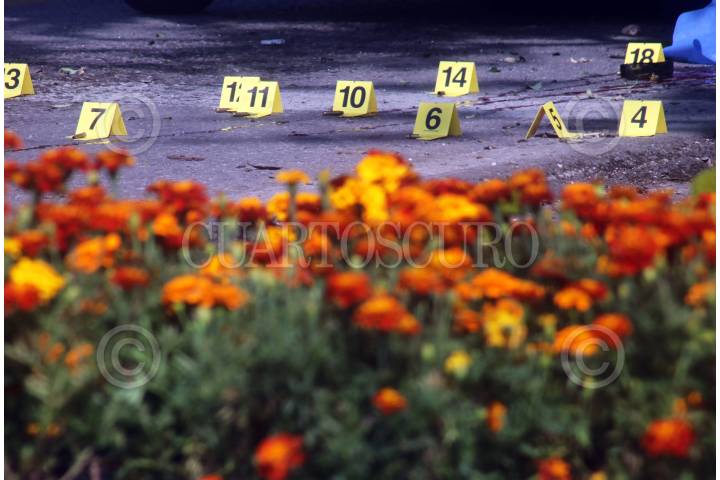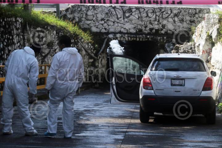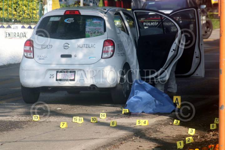 CUERNAVACA, MORELOS, 24OCTUBRE2019.- Un mando de la policía de Morelos fue acribillado cuando se trasladaba a su domicilio a bordo de un taxi, los hechos ocurrieron pasadas las nueve de la mañana cuando el oficial, identificado como Eduardo, fue atacado por al menos dos hombres en la carretera federal Cuernavaca-México, a la altura de la colonia Buenavista. La víctima vestía el uniforme y quedó a lado de la portezuela trasera derecha del vehículo. Peritos e investigadores de la Fiscalía recabaron más de 25 cartuchos percutidos de arma 9 milímetros y 7.62. Este policía había sido mencionado en mensajes que presuntamente deja la delincuencia en la entidad. Una camioneta relacionada con el crimen fue asegurada en un puente que comunica con el poblado de Chamilpa. FOTO: MARGARITO PÉREZ RETANA /CUARTOSCURO.COM