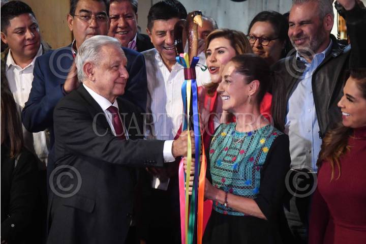 CIUDAD DE MÉXICO, 07SEPTIEMBRE2023.- Andrés Manuel López Obrador, realizó la entrega de bastón se mando a Claudia Sheinbaum, como nueva coordinadora de los Trabajos de Defensa de la Transformación. FOTO: MARIO JASSO/CUARTOSCURO.COM