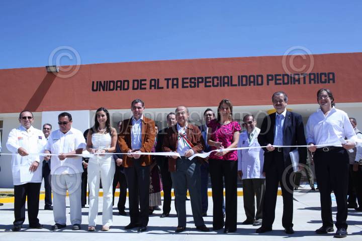 MUNICIPIO DE SAN BARTOLO COYOTEPEC, OAXACA, 15FEBRERO2011.- Mané Sánchez Cámara y su esposo Gabino Cué Monteagudo, gobernador de la entidad; Felipe Calderón Hinojosa, presidente de los Estados Unidos Mexicanos y su esposa Margarita Zavala, además de José Ángel Córdova Villalobos, secretario de Salud, durante la inauguración de la ampliación del "Hospital de la Niñez Oaxaqueña". FOTO: ALFREDO GUERRERO/CUARTOSCURO.COM