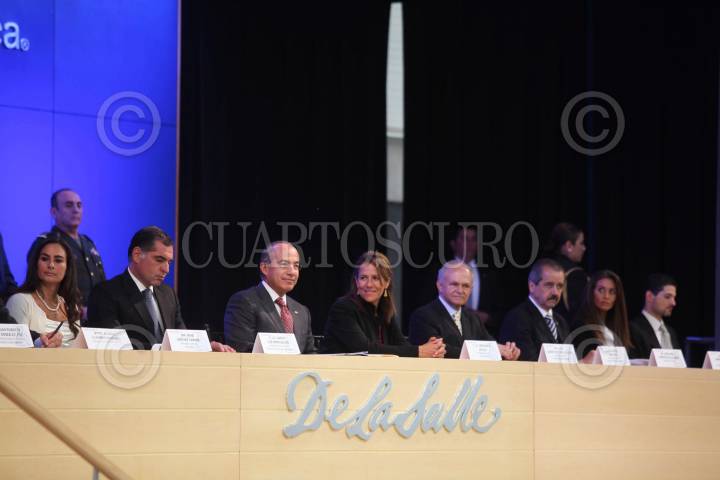 MUNICIPIO DE SANTA CRUZ XOXOCOTLAN, OAXACA, 15FEBRERO2011.- Mané Sánchez Cámara y su esposo Gabino Cué Monteagudo, gobernador de la entidad;Felipe Calderón Hinojosa, presidente de los Estados Unidos Mexicanos y su esposa Margarita Zavala; además de el empresario Alfredo Harp Helú y José Ángel Córdova Villalobos, secretario de Salud, durante la inauguración de la Universidad La Salle. FOTO: ALFREDO GUERRERO/CUARTOSCURO.COM