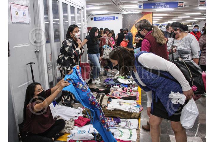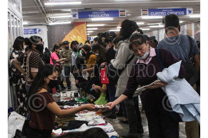 Mujeres de distintos colectivos, durante bazar de venta y truque instalado en los pasillos de la estación Hidalgo del Metro. FOTO: ROGELIO MORALES /CUARTOSCURO.COM