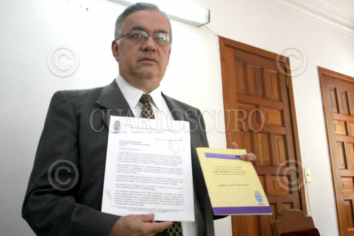 MEXICO, D.F. 15JULIO2005.- Guillermo Bustamante Manilla, presidente de la Unión Nacional de Padres de Familia, muestra lod documentos donde dan a cnocer su postura sobre la pastilla anticonseptiva de emergencia. FOTO: Nelly Salas/CUARTOSCURO.COM