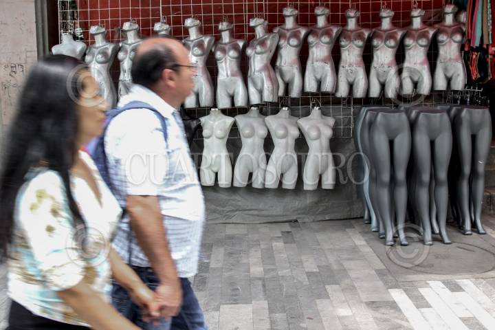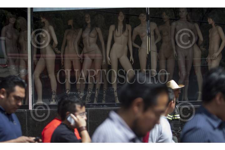 Vendedoras se asoman entre maniquíes de mujeres en una tienda del Centro Histórico