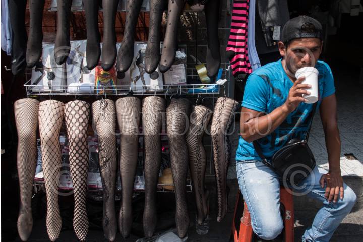 CIUDAD DE MÉXICO, 22JUNIO2017.- Un comerciante de La Merced bebe refresco mientras espera vender algunas medias para mujeres. FOTO: TERCERO DÍAZ /CUARTOSCURO.COM