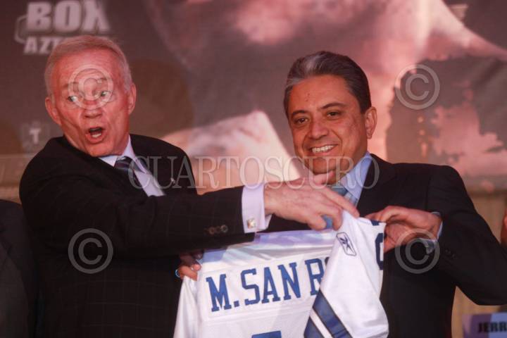 MÉXICO, D.F., 02FEBRERO2010.- Mario San Roman Director General de TV Azteca, recibe de manos del propietario de los Dallas Cowboys, Jerry Jones una playera durante la conferencia de prensa donde se dieron a conocer los detalles sobre la Pelea de Box entre Manny Pacquiao y Joshua Clottey FOTO: SÁSHENKA GUTIÉRREZ/CUARTOSCURO.COM