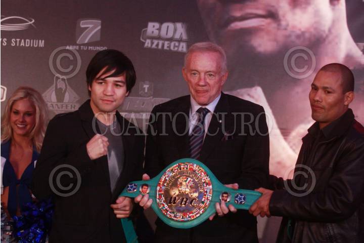 MÉXICO, D.F., 02FEBRERO2010.- José Sulaiman presidente del Consejo Mundial de Boxeo (CMB) entrega un cinturón al propietario de los Dallas Cowboys, Jerry Jones durante la conferencia de prensa donde se dieron a conocer los detalles sobre la Pelea de Box entre Manny Pacquiao y Joshua Clottey FOTO: SÁSHENKA GUTIÉRREZ/CUARTOSCURO.COM