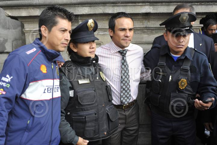 MÉXICO, D.F., 08SEPTIEMBRE2011.- Juan Manuel Márquez, boxeador mexicano, se tomo la foto del recuerdo con unos policías durante el recorrido con el que será su rival el filipino Manny Pacquiao. Ambos pugilista recorrieron la ciudad montados en un turibus como promoción de su pelea que se realizará en las Vegas, Nevada. FOTO: GABINO ACEVEDO/CUARTOSCURO.COM