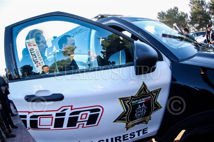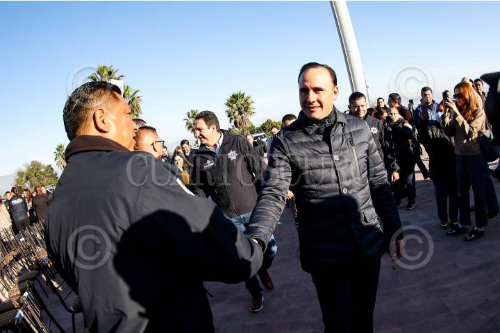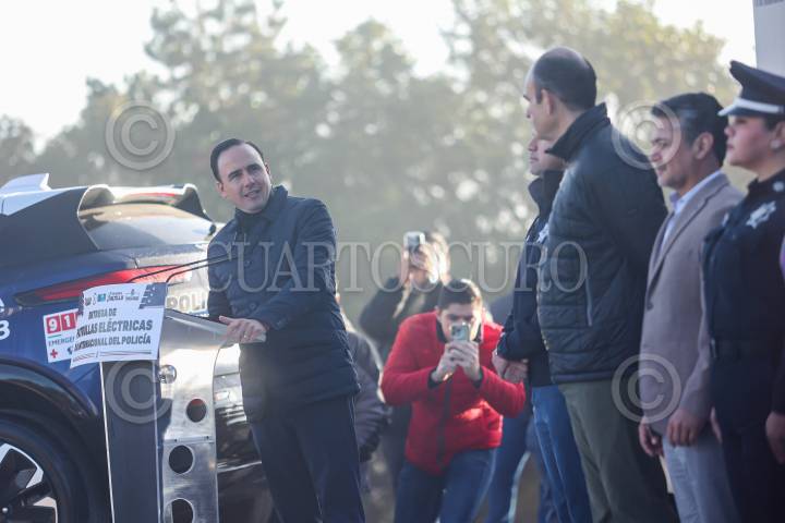 SALTILLO, COAHUILA, 02ENERO2025.- El gobernador del estado de Coahuila, Manolo Jiménez Salinas, junto con el alcalde Javier Díaz González entregaron hoy, en el Día del Policía, 37 patrullas. El evento se realizó en el Parque las Maravillas. El mandatario enfatizó que con estas unidades se reforzará el blindaje de seguridad de Saltillo. FOTO: ALEJANDRO RODRÍGUEZ/CUARTOSCURO.COM