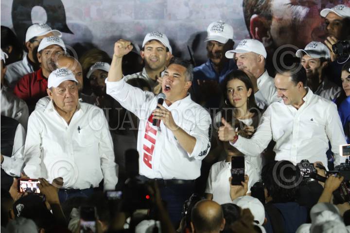 Manolo Jiménez, candidato a la gubernatura de Coahuila por el PRI-PAN-PRD, festejo su virtual triunfo en las elecciones del día de hoy. Lo acompañaron Jesús Zambrano, Alejandro Moreno Cárdenas y Matko Cortés. FOTO: