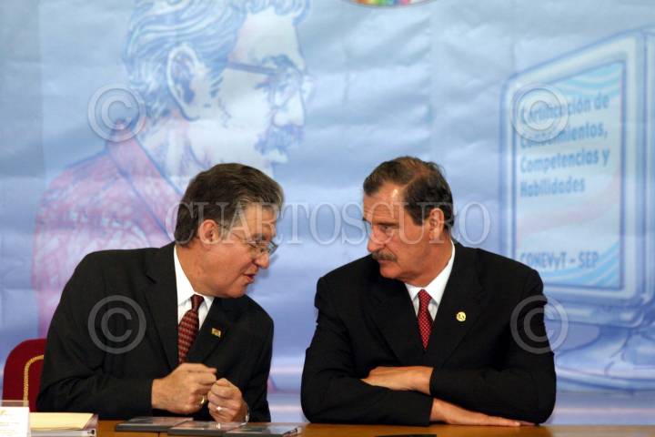 MEXICO, D.F., 14MARZO2005.- Vicente Fox Quesada, presidente de la República y Ramón de la Peña Manrique, presidente del Consejo Nacional de Educación para la Vida y el Trabajo, durante la ceremonia de Certificación CONEVyT: Logros de un Trabajo Conjunto, en la residencia de los Pinos. FOTO: Moisés Pablo/CUARTOSCURO.COM
