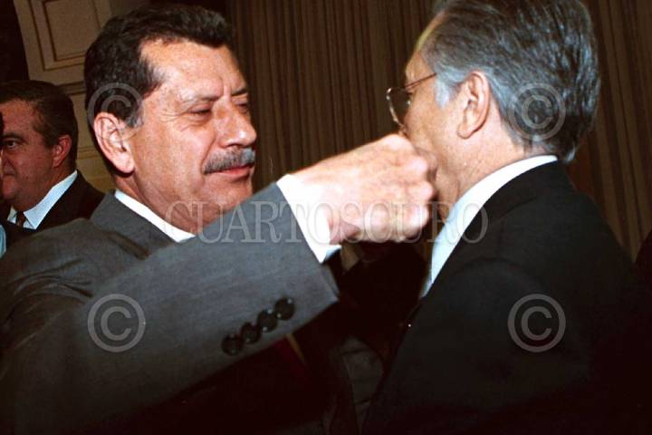 Enrique Jackson (PRI) se despide del Manuel Bartlet (PRI) al terminó de la sesión en la Cámara Alta la cual aprobó el dictamen mediante el cual se crea la Comisión Nacional de Asuntos Indígenas, en sustitución del Instituto Nacional Indigenista. FOTO: Eunice Adorno/CUARTOSCURO.COM