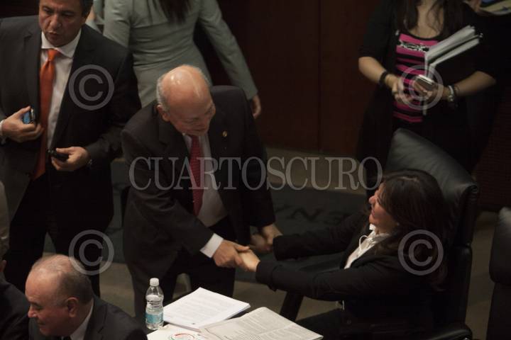 MÉXICO, D.F., 07MARZO2013.- Manuel Cavazos Lerma saluda a Mónica Arreola, senadora del PANAL, en sesión de la Cámara de Senadores. FOTO: MOISÉS PABLO /CUARTOSCURO.COM