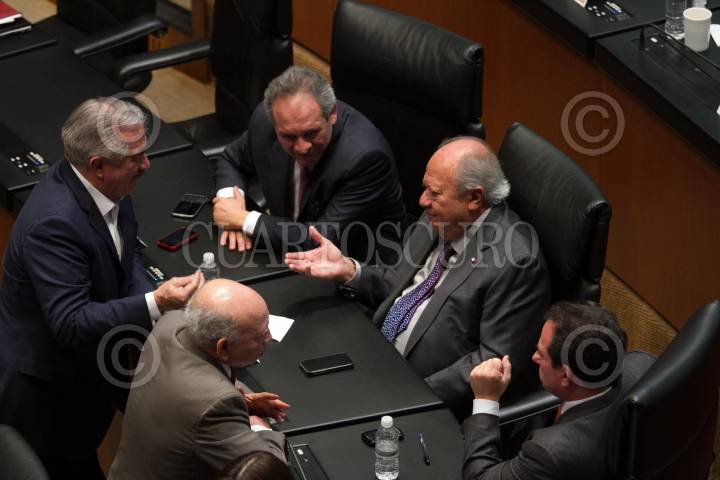 CIUDAD DE MÉXICO, 29MARZO2016.- Los senadores del PRI; Patricio Martínez, Gerardo Sánchez García, Carlos Romero Deschamps, Manuel Cavazos Lerma, y José Francisco Yunes Zorrilla, durante la sesión en la Cámara de Senadores. FOTO: MOISÉS PABLO /CUARTOSCURO.COM