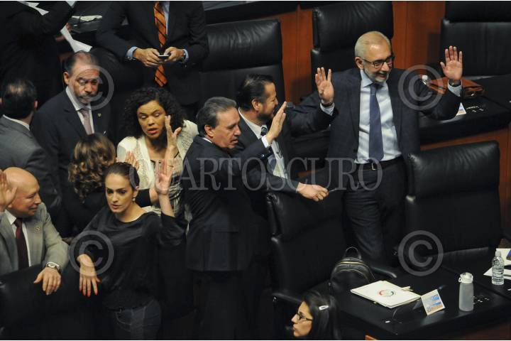 CIUDAD DE MÉXICO, 28ABRIL2016.- Los senadores Manuel Cavazos Lerma, Iris VIaney, Mariana Vega Casillas, Emilio Gamboa, Fernando Herrera, y Salvador Vega Casiilas, votan en la sesión en la Cámara Alta. FOTO: DIEGO SIMÓN SÁNCHEZ /CUARTOSCURO.COM
