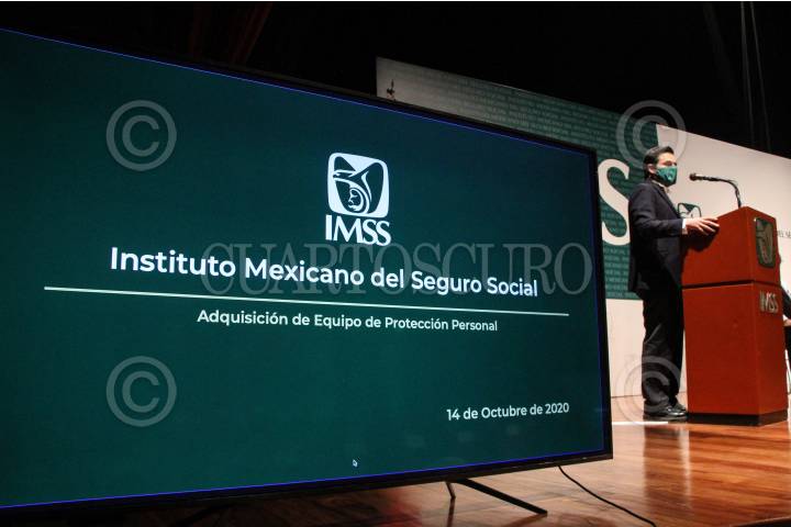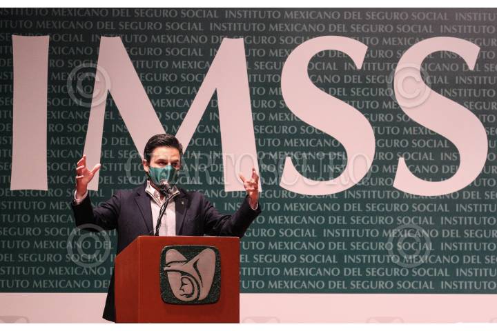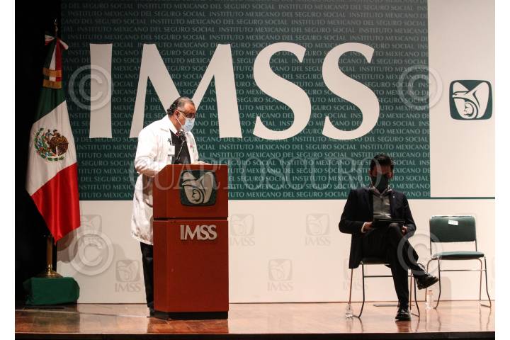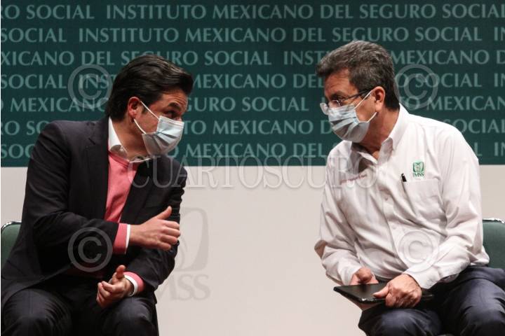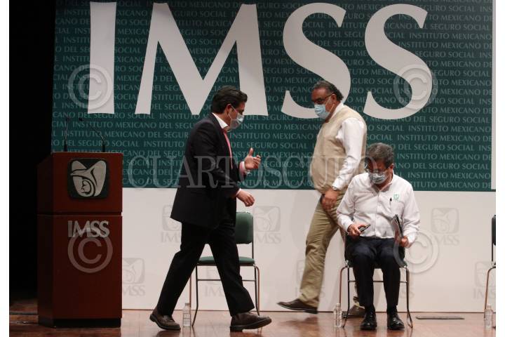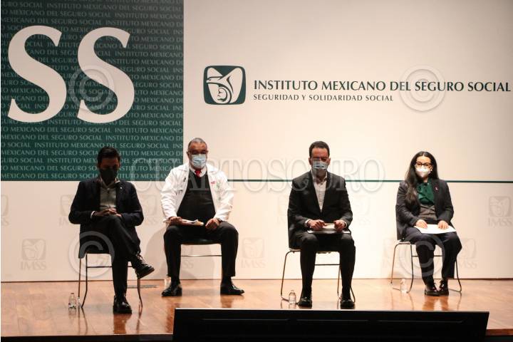 Zoé Robledo, Manuel Cervantes, Victorio Hugo Borja durante la conferencia de prensa del IMSS el Teatro Moisés Callejas.
