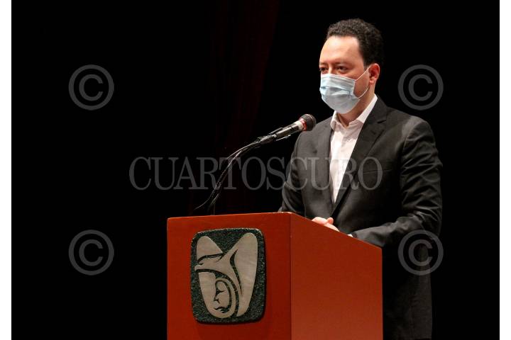 Zoé Robledo, Manuel Cervantes, Umberto Pedredo y Patricia Pérez, durante conferencia de prensa en el Teatro Juan Moisés Calleja. FOTO: ROGELIO MORALES /CUARTOSCURO.COM