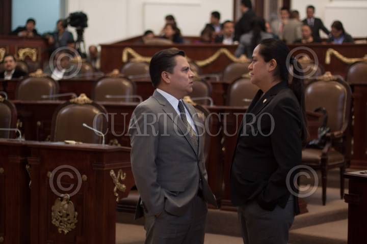 MÉXICO, D.F., 02OCTUBRE2013.- Los diputados Manuel Covarrubias y Ariadna Montiel Reyes durante la sesión conmemorativa de la matanza de 1968 en la Plaza de las Tres Culturas en Tlatelolco durante la sesión solemne en la Asamblea Legislativa. FOTO: MOISÉS PABLO /CUARTOSCURO.COM