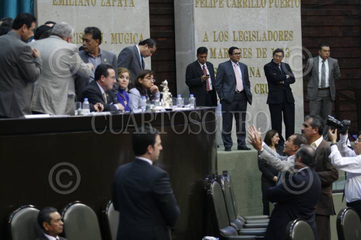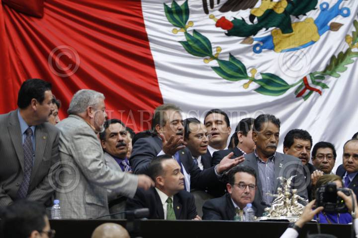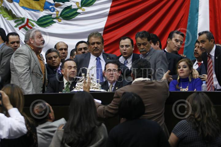 MÉXICO, D.F., 19DICIEMBRE2012.- Los diputados de izquierda tomaron la tribuna en protesta de la negativa de que se le diera la palabra al petista Manuel Huerta, esto para expresar su posicionamiento en torno a la discusión de la Reforma Educativa. FOTO: IVÁN MENDEZ /CUARTOSCURO.COM