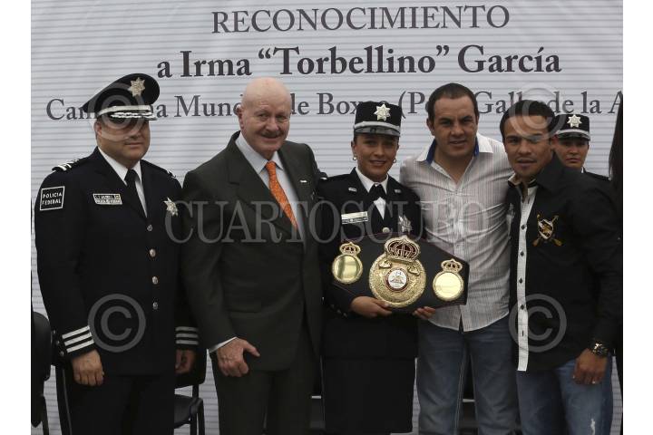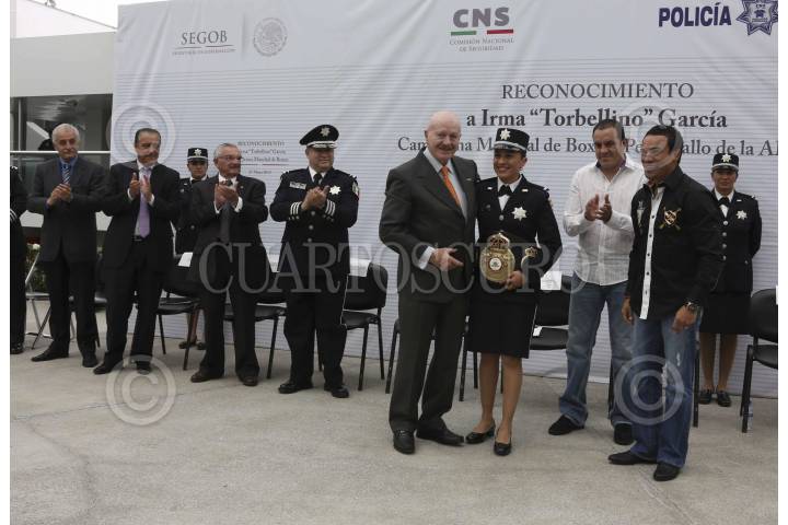 MÉXICO, D.F., 27MAYO2013.- Manuel Mondragón Ikalb, Comisionado Nacional de Seguridad, acompañado del futbolista Cuahutemoc Blanco y el boxeador Juan Manuel Marquez, durante el reconocimiento a la suboficial de la Policía Federal, Irma García Núñez, campeona mundial de boxeo femenil en peso gallo. FOTO: CUARTOSCURO.COM